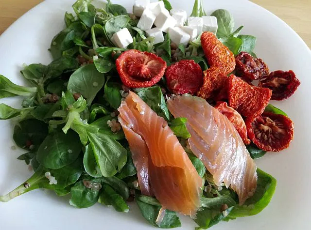 4º Mezclar todos los ingredientes, utilizando de base los canónigos, lentejas y quinoa y decorando con tiras de salmón ahumado, queso en cubos y tomates secos para conseguir un delicioso sabor.
